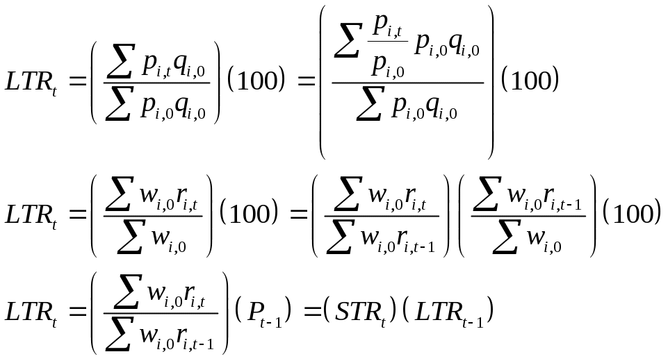 IPP uses the items that are initiated and re-priced every month to compute its indexes of price change. These indexes are calculated using a modified Laspeyres index formula. The modification differs from the conventional Laspeyres in that the IPP uses a chained index instead of a fixed-base index. Chaining involves multiplying an index (or long term relative) by a short term relative (STR). This is useful since the product mix available for calculating indexes of price change can change over time. These two methods produce identical results as long as the market basket of items does not change over time and each item provides a usable price in every period. In reality, the mix of items available at time t is somewhat different than what was available in the base period. In fact, due to non-response, the mix of items used in the index from one period to the next is often different. The benefits of chaining over a fixed base index include a better reflection of changing economic conditions, technological progress, and spending patterns, and a suitable means for handling items that are not traded every calculation month.