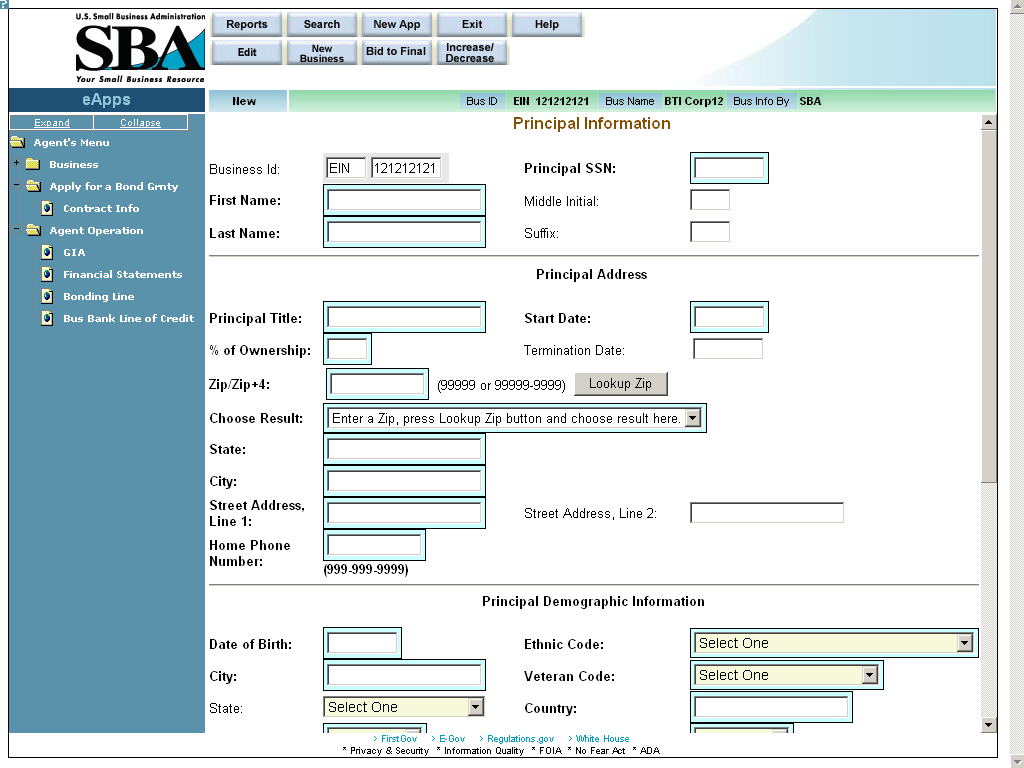 Bond (Note: The agent can only enter values in fields on the left-hand side of the screen; the fields on the right-hand side of the screen are reserved for use by the SBA and are display-only.)