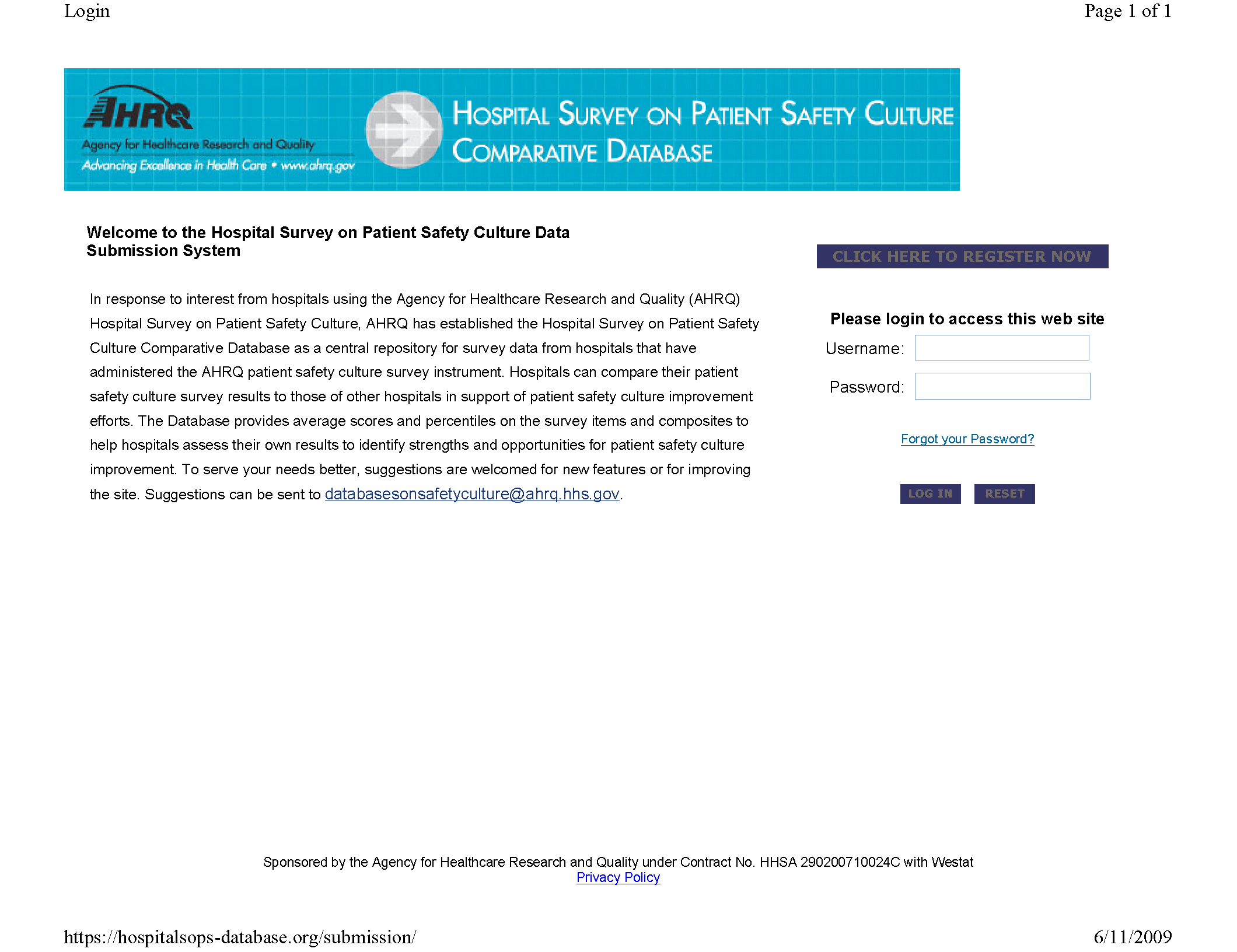 ATTACHMENT B-2: AHRQ Hospital Survey on Patient Safety Culture Comparative Database, Supporting Statement B-- Screen shots of Hospital SOPS Data Submission Web Site Information Collection Forms