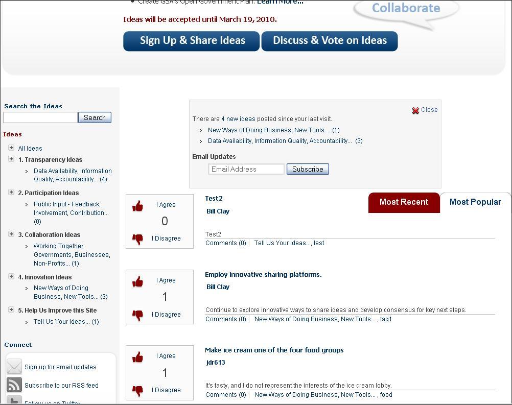 The Open Government Citizen Engagement will allow the public to weigh in on their support for agency and public ideas, comments, suggestions, data sets, and the like, and allow agencies to engage with the public via Ratings, Rankings and Flaggings (see picture below). The goal is to allow the public to rate and rank open-ended, general questions, comments and suggestions. Tools that allow rating, ranking and flagging (for example, many blogs, ideation, challenge grant platforms, and other social media tools), can be used across government.