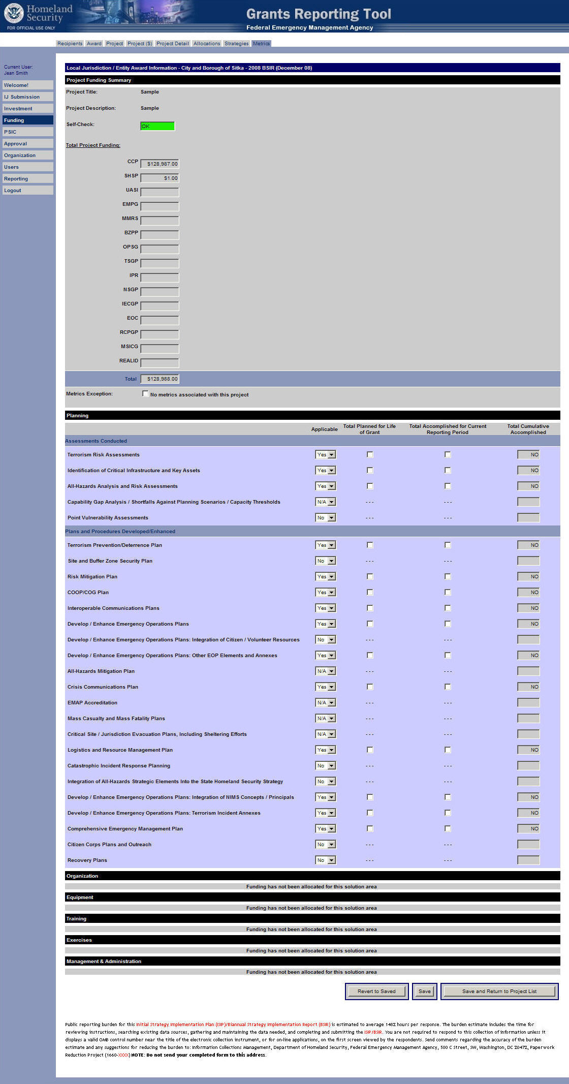 Funding Module – Metrics Tab – Tenth Screen
