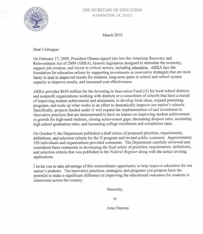 Purpose of Program: The Investing in Innovation Fund, established under section 14007 of the American Recovery and Reinvestment Act of 2009 (ARRA), provides funding to support (1) local educational agencies (LEAs), and (2) nonprofit organizations in partnership with (a) one or more LEAs or (b) a consortium of schools. The purpose of this program is to provide competitive grants to applicants with a record of improving student achievement and attainment in order to expand the implementation of, and investment in, innovative practices that are demonstrated to have an impact on improving student achievement or student growth (as defined in this notice), closing achievement gaps, decreasing dropout rates, increasing high school graduation rates, or increasing college enrollment and completion rates.