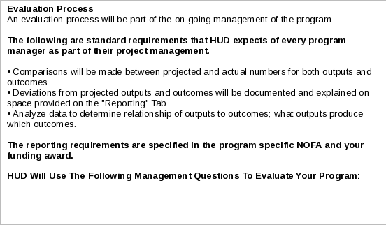 | HUD Goals | Policy Priority | Problem, Need, Situation | Services or Activities/Outputs | Measure | Outcome | Measure | Evaluation Tools | |||||