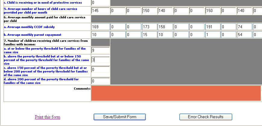 Use the comments field to explain any unusual or inconsistent data. For example, if the number of families and children you served changed drastically from your prior year’s report, you may want to indicate the reason for the change.