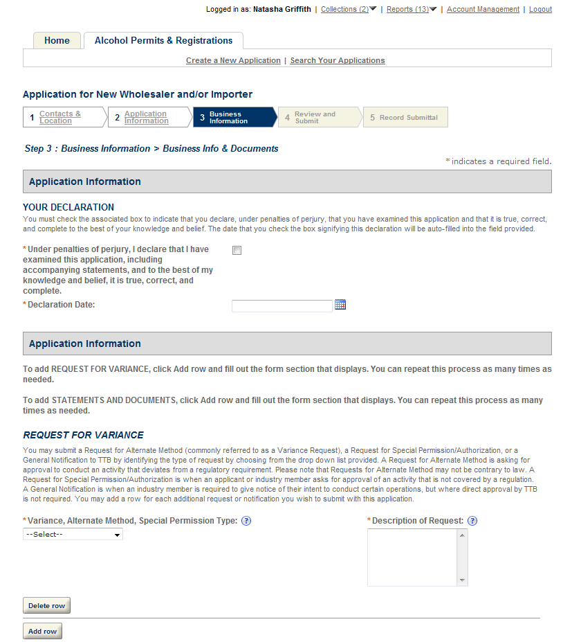 The following screens depict what a typical industry member would need to fill out for completing the New Wholesaler/Importer application which is a collection of the following OMB forms:
