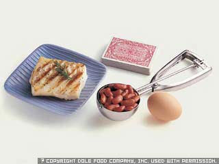 Meat and beans Familiar objects can help a person picture proper portions for meat, poultry, fish and beans. For example, a 3-ounce serving of fish is about the size of a deck of cards. Here are the serving sizes for meat and meat substitutes: |