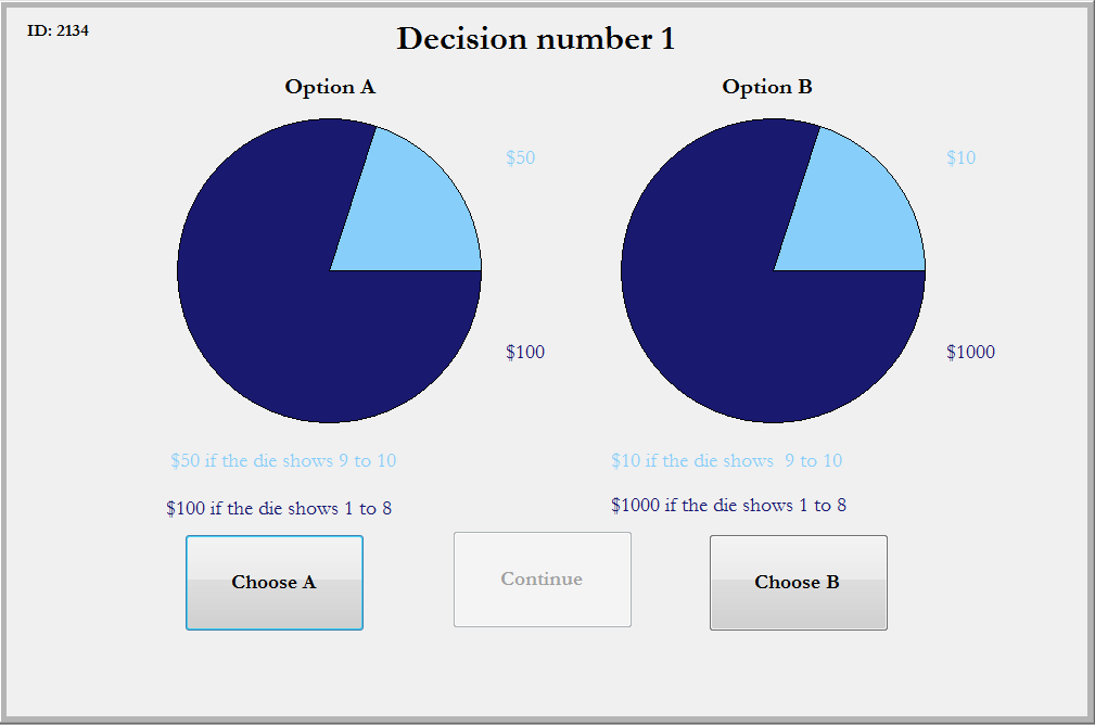 These choices will be made in the same manner as before, and we will be using a 10-sided die to play them out to see your earnings.