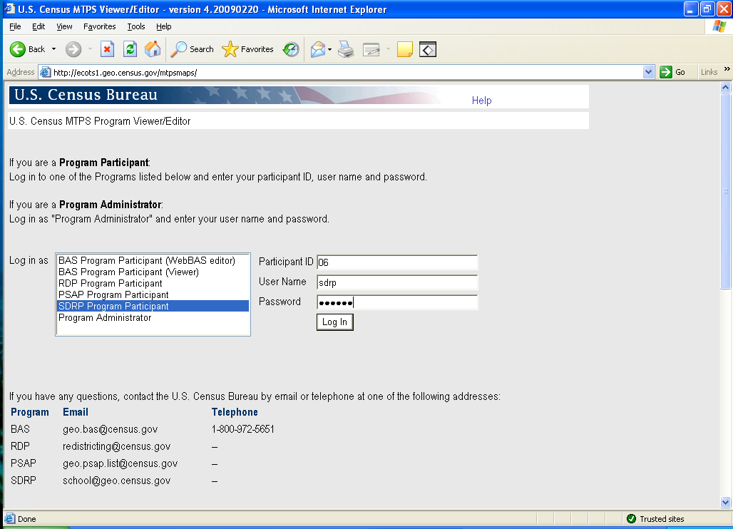In order to login to the MTPS Viewer, go to: http://ecots1.geo.census.gov/mtpsmaps/