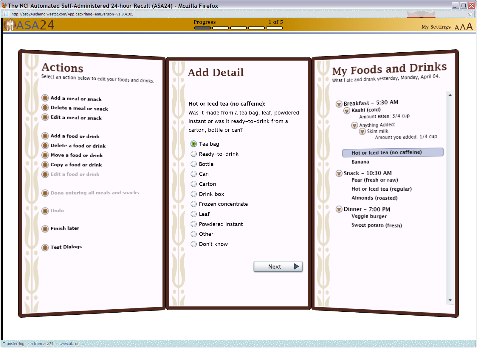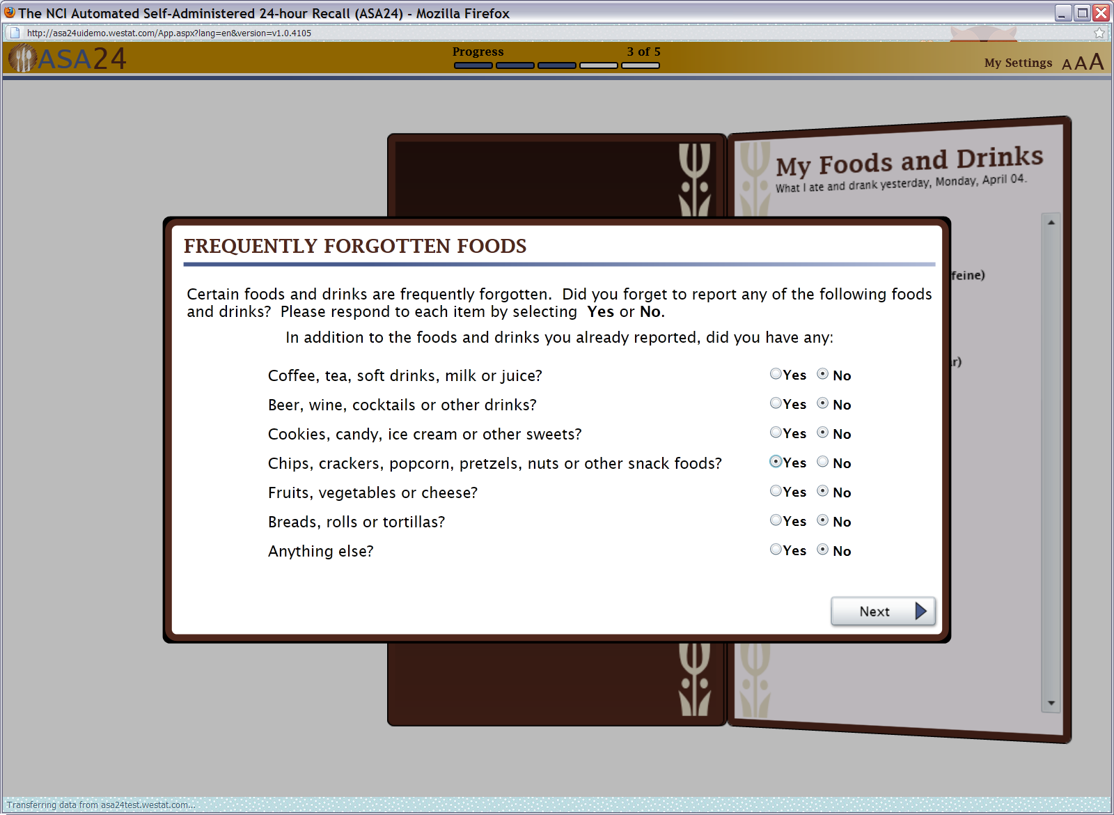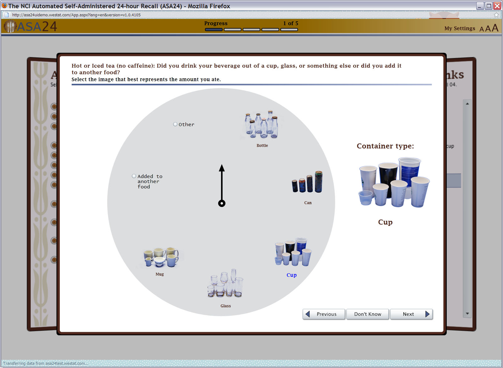 Prior evaluation of the initial ASA24 Respondent website system has consisted of very preliminary usability testing during development by Westat, the prime contractor for system development. Five development/usability tests of 9 or fewer participants were conducted: 1) a computer-based test to determine whether respondents preferred reporting foods using a meal-based vs. unstructured method (Subar AF, Thompson FE, Potischman N, et al., J Am Diet Assn. 2007;107:1002-1007); 2) a sorting task and focus group to aid in development of a food grouping system for use in browsing; 3) a paper-based focus group testing different screen formats to be used for food reporting; 4) a paper-based focus group testing that varied screen formats to be used for asking detailed questions about food preparation and portion size; and 5) a study to ascertain the optimal method for displaying food images to aid in portion size estimation (Subar AF, Crafts J, Zimmerman TP, et al. J Am Dietet Assn 2010;110:55-64).