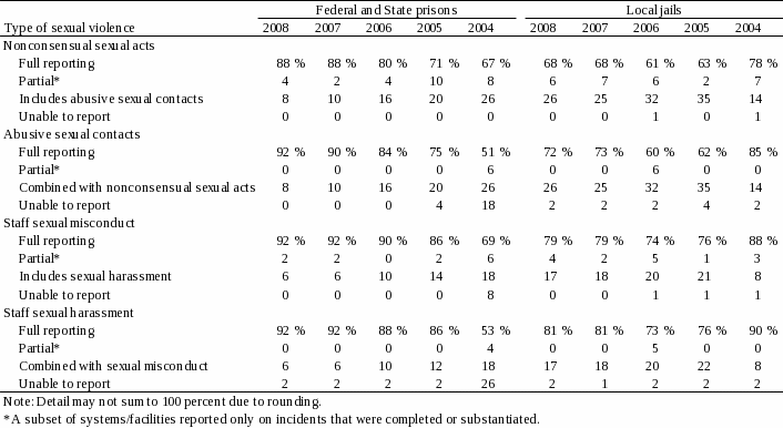 Overall, the data demonstrate an increasing capacity to provide data. Measures of nonconsensual sexual acts have the highest percentage of partial reporting (6% in jails), prisons and jails report that the they are most unable to report on incidents of staff sexual misconduct (2%); some 2% of jails are unable to report abusive sexual contacts, as well. BJS believes that such low levels do not impair the ability to draw accurate estimates of sexual violence by type. BJS reports these deviations from the reporting criteria, but does not introduce adjustments to account for these deviations. Instead, BJS provides detailed appendix tables containing notes deviations for applicable facilities/jurisdictions.