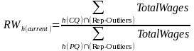For wage imputation, the wage ratio is computed for each cell by dividing the sum of wages of all reported units of the current quarter excluding influential observations by the sum of wages of all reported units of the previous quarter excluding influential observations. The formula for wage cell ratio is: