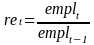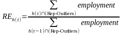 For the purpose of employment imputation for each cell h, three employment cell ratios are calculated for every month of the current quarter: REh(4), REh(5), REh(6). A cell ratio is a quotient of the sum of employment for all the reported units excluding the influential observations of the imputation month and the sum of employment of all the reported units excluding the influential observations of the prior month. The formula for employment cell ratio is: