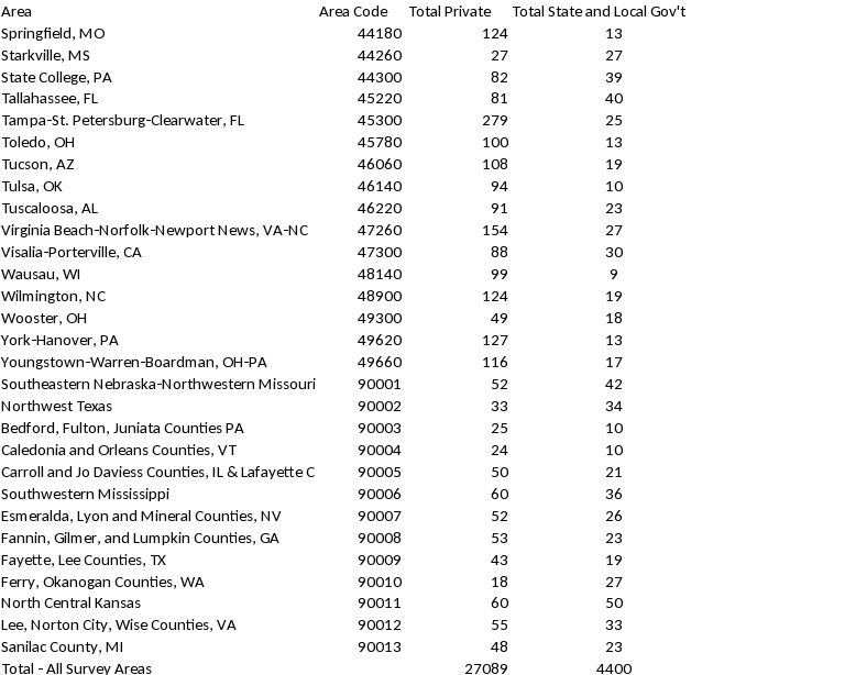 Stratification—The NCS sample, including the LPS, has 31,700 establishments allocated based on the stratification of ownership (private, state government, local government), nine Census divisions, 24 industries for private, and 10 industries for state and local government. Self-representing, certainty establishments are assigned a sampling weight of 1.00 and non-certainty establishments are assigned a sampling weight equal to the inverse of their selection probability. Establishment counts for the sample, by area and ownership, are shown in Appendix A. In-scope private employment and establishment counts for the NCS Survey Areas are summarized by geographic area in Appendix A.