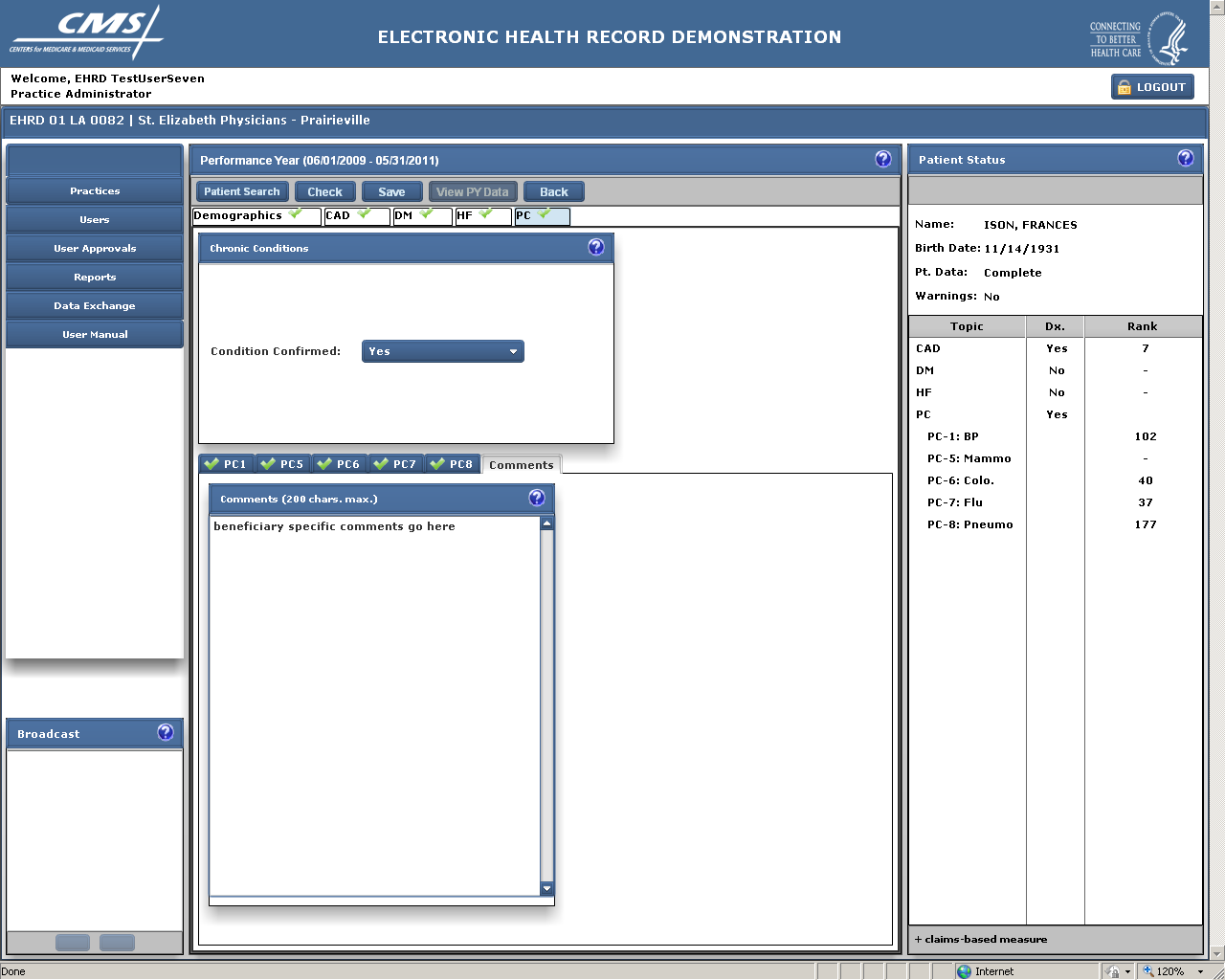 Once a user selects a practice, the list of patients associated with the practice that has been selected for reporting shows. A user can search for a patient by Medicare ID, Last Name, First Name or Birth Date. Similarly, the list of patients can be sorted by any of those fields. In addition, there is a list of clinical reporting “topic” areas listed above the patient list: CAD (coronary artery disease), DM (diabetes mellitus), HF (heart failure), and PC-1, 5, 6, 7 and 8. Each of these boxes represents quality measures related to these conditions. The “PC” boxes relate to specific preventive care related quality measures (blood pressure measurement, immunizations, and cancer screenings). By clicking on any one or more of these boxes a user can search for patients to be reported on in any one of these categories.
