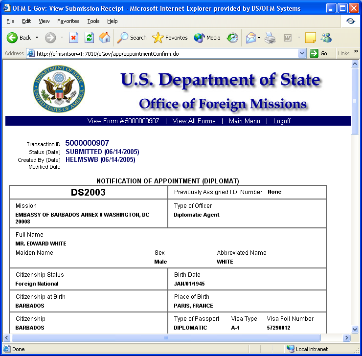 Figure 8.1-25 – Submission Receipt for Notification of Appointment (Diplomat)