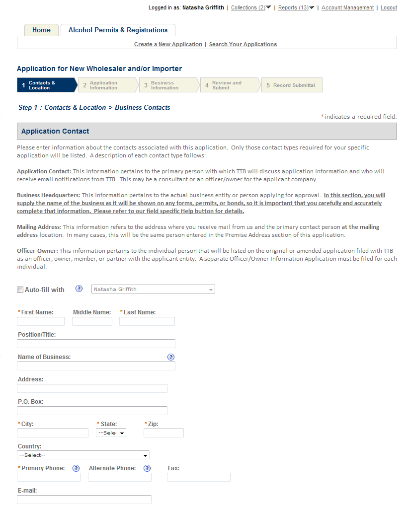 The following screens depict what a typical industry member would need to fill out for completing the New Wholesaler/Importer application which is a collection of the following OMB forms: