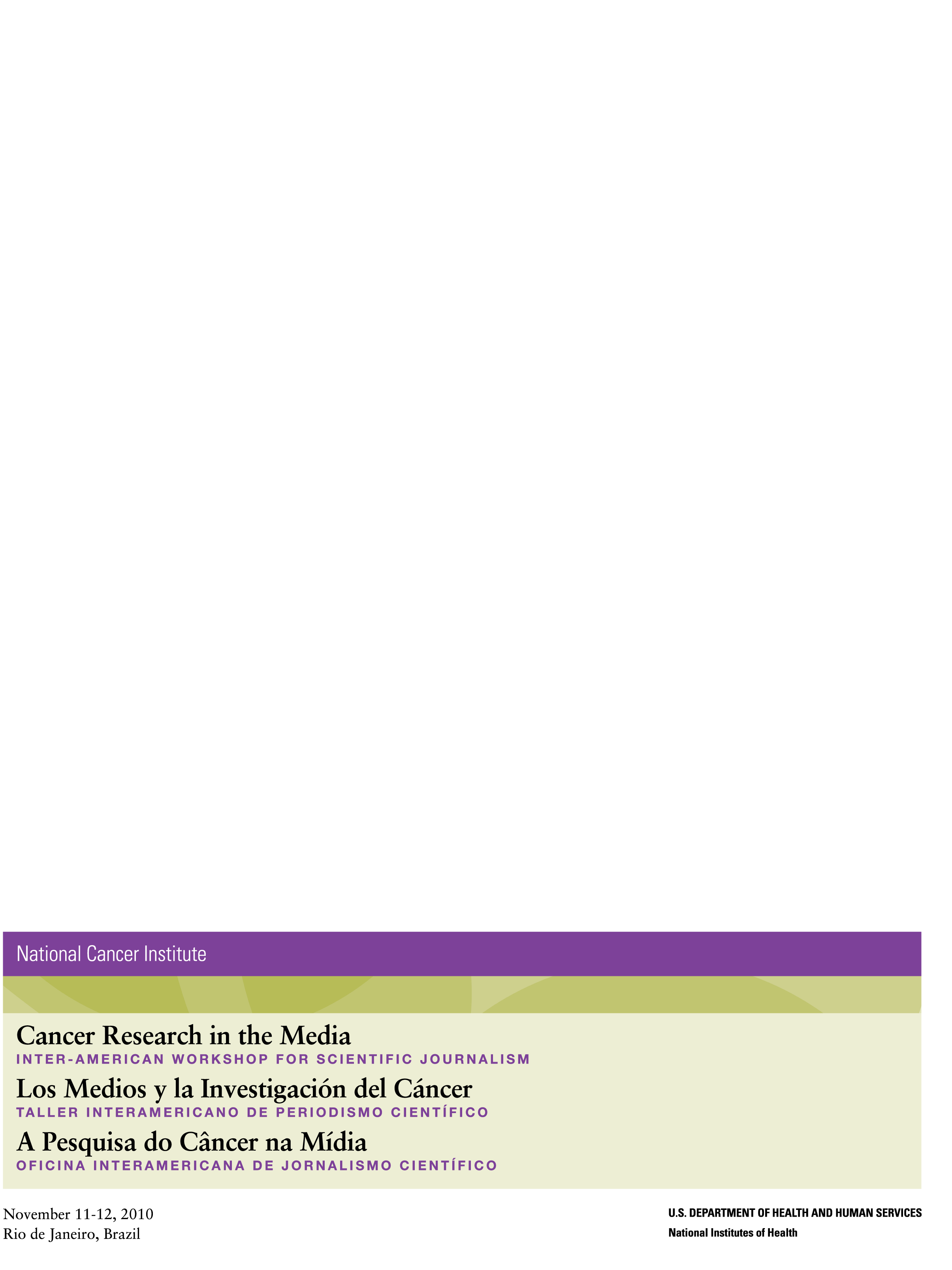 The National Cancer Institute’s Office of Communications and Education is evaluating their Cancer Research in the Media workshop program in order to improve future workshops. As a participant in one of these workshops, we would appreciate it if you could complete a brief survey. The purpose of this long-term follow-up survey is to assess how you may have applied the knowledge and skills you learned during the Cancer Research in the Media workshop that took place in Rio de Janeiro in November 2010. The survey should take no more than 15 minutes to complete, and responses will be kept secure to the extent provided by law. Results will only be reported in aggregate form and we appreciate your honest answers. Please follow the link below to access the on-line survey.