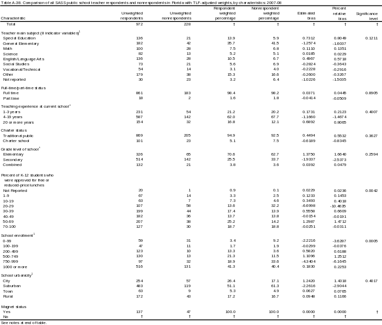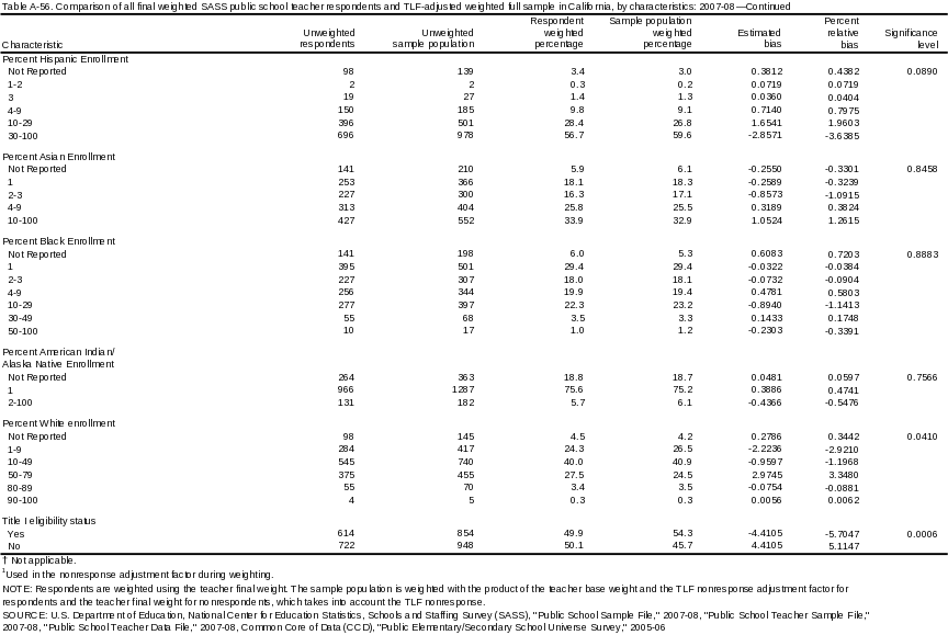 Similar comparisons are made using the final weight to evaluate the effect of the teacher nonresponse adjustment factors. However, instead of comparing respondents and nonrespondents, shared characteristics of respondents are compared to the original sample to estimate the effect of weighting. Schools and teachers that were deemed to be out-of-scope after data collection began were excluded from this analysis. Therefore, the original sample populations were slightly larger than those used for this analysis.