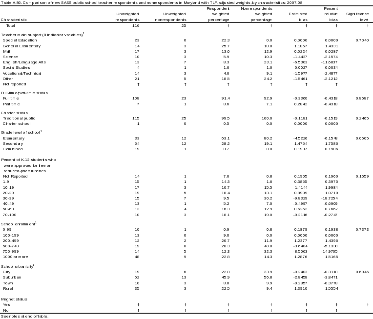 The final-weighted state table for Maryland (described at the end of this appendix) shows that there are eighteen characteristics with significant (+/- 5) percent relative bias. There was significant TLF nonresponse bias for schools with the following characteristics: