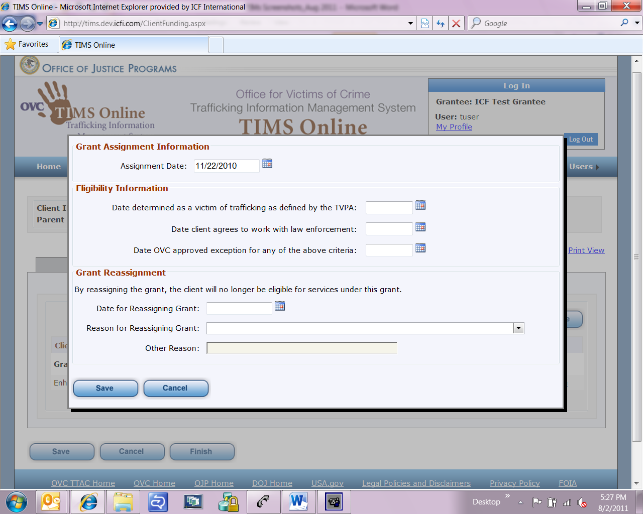 Screenshots of TIMS Online for OMB Submission