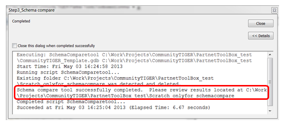 Once processing is complete, the Schema Compare tool’s results will be created in the folder and displayed in the geoprocessing log, as highlighted in the graphic below.