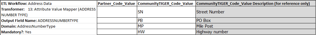 ETL Configuration Template.xlsx: This spreadsheet is used to create the value mappings between partner codes for various data fields and the required codes used in the Community TIGER data schema.