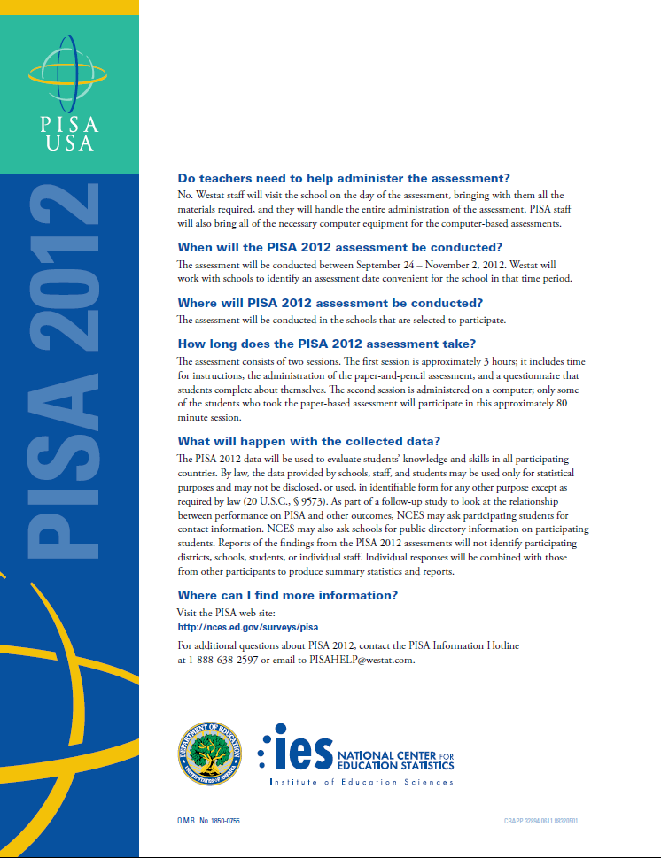 PISA is described in more detail in the enclosed materials. PISA is sponsored in the United States by the National Center for Education Statistics (NCES) in the U.S. Department of Education and is conducted by Westat in Rockville, Maryland. The U.S. Office of Management and Budget has approved the data collection under OMB #1850-0755. For information on the confidentiality of the data collected, please see the enclosed FAQ. While participation in this study is voluntary, we ask your agency to support participation on the part of schools in your state so that the United States has a representative sample of schools across the country.