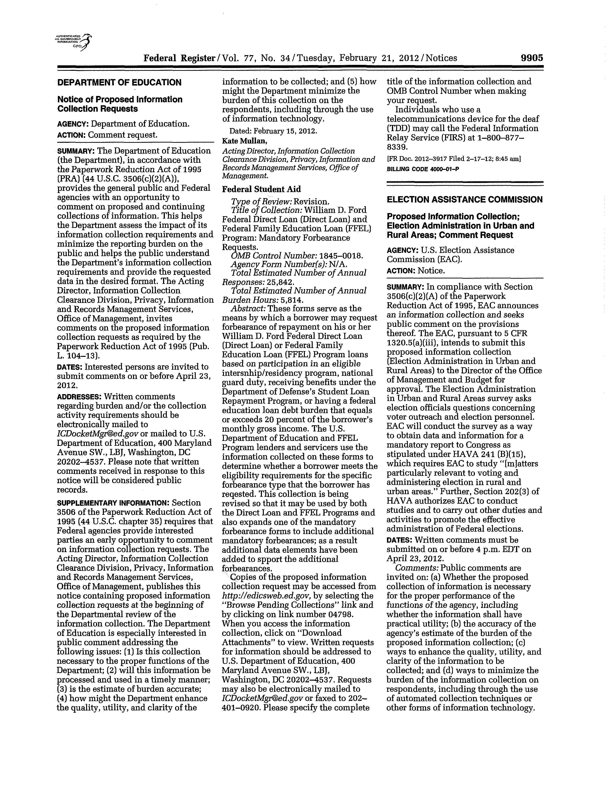 On May 16, 2012 EAC, in consultation with its survey contractor Human Resources Research Organization (HumRRO), submitted to OMB, its supporting statement related to a request for OMB approval to conduct a survey of local election officials on the administration of elections in urban and rural areas.