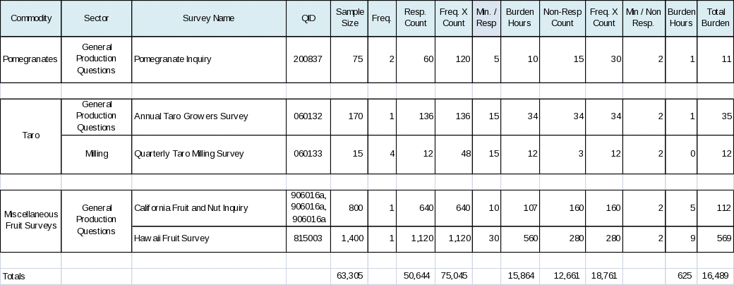 The program changes include the addition of a new pomegranate survey, the renewal of a maple syrup survey that is conducted once every five years, the merging of several smaller specialty surveys into a couple of more comprehensive surveys, along with several other miscellaneous activities. Following the data capture of the 2007 Census of Agriculture data, NASS was able to adjust its sample size estimates. The sample sizes used to calculate the burden hours in the table in paragraph A-12 were based on the data captured from the Census data.