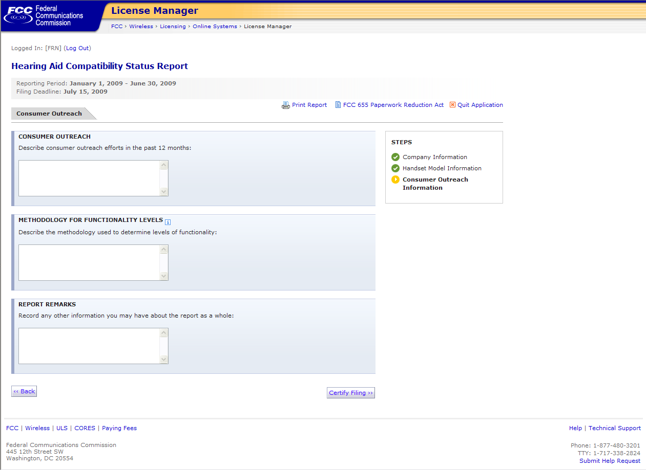 This document does not include the login process to License Manager or steps to begin/continue a HAC report. These screens are only those questions found on FCC Form 655.
