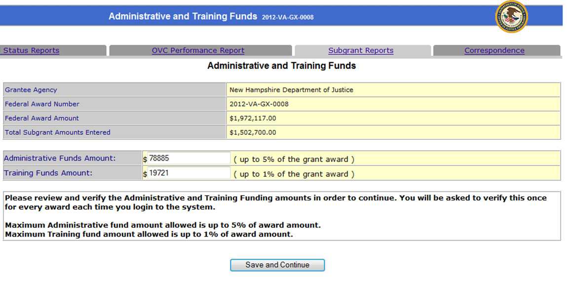 OVC PPSR Sub 1- OVC Subgrants Administrative and Training Funds Screen