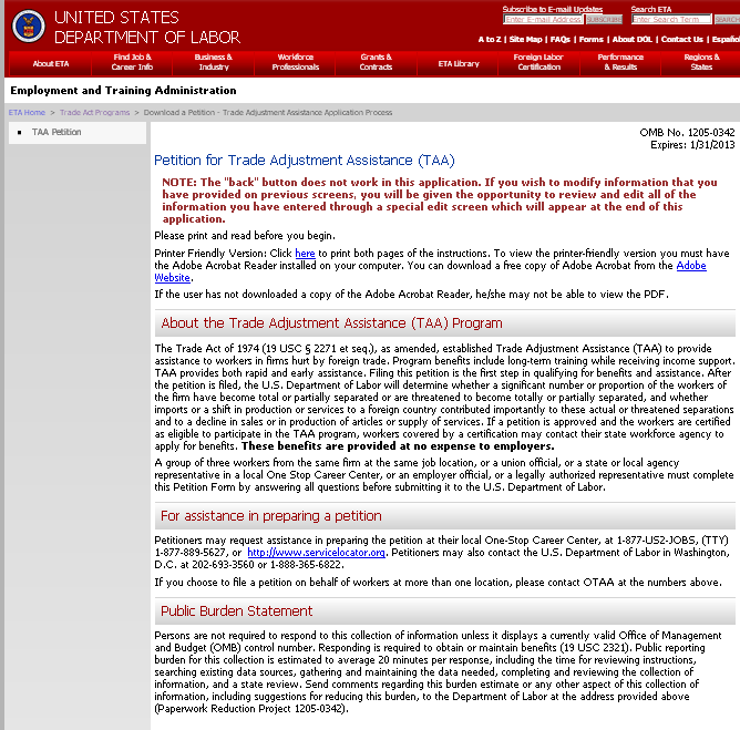 The Trade Act of 1974 (19 USC § 2271 et seq.), as amended, established Trade Adjustment Assistance (TAA) to provide assistance to workers in firms hurt by foreign trade. Program benefits include long-term training while receiving income support. TAA provides both rapid and early assistance. Filing this petition is the first step in qualifying for TAA benefits and assistance. After the petition is filed, the U.S. Department of Labor will determine whether a significant number or proportion of the workers of the firm have become total or partially separated or are threatened to become totally or partially separated, and whether imports or a shift in production or services to a foreign country contributed importantly to these actual or threatened separations and to a decline in sales or in production of articles or supply of services. If a petition is approved and the workers are certified as eligible to participate in the TAA program, workers covered by a certification may contact their state workforce agency to apply for benefits. These benefits are provided at no expense to employers.