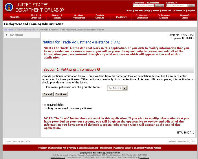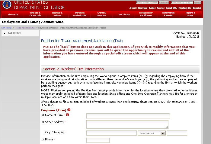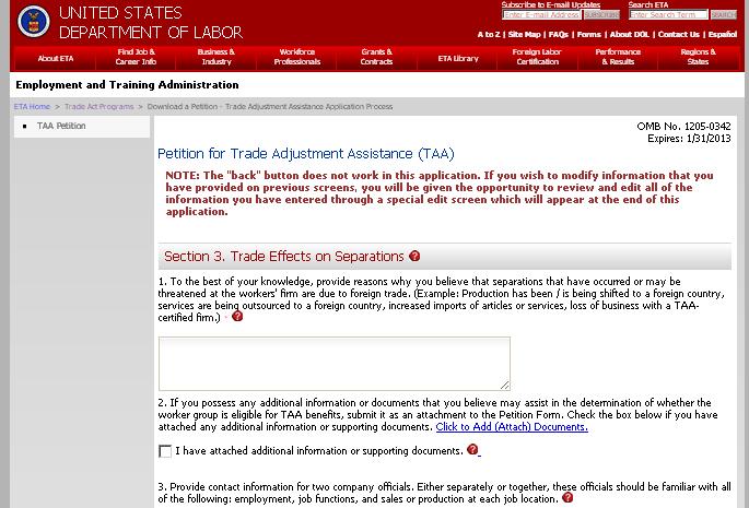 Persons are not required to respond to this collection of information unless it displays a currently valid Office of Management and Budget (OMB) control number. Responding is required to obtain or maintain benefits (19 USC 2321 and 2271). Public reporting burden for this collection is estimated to average 20 minutes per response, including the time for reviewing instructions, searching existing data sources, gathering and maintaining the data needed, completing and reviewing the collection of information, and a state review. Send comments regarding this burden estimate or any other aspect of this collection of information, including suggestions for reducing this burden, to the U.S. Department of Labor at the address provided above (Paperwork Reduction Project 1205-0342).
