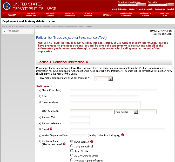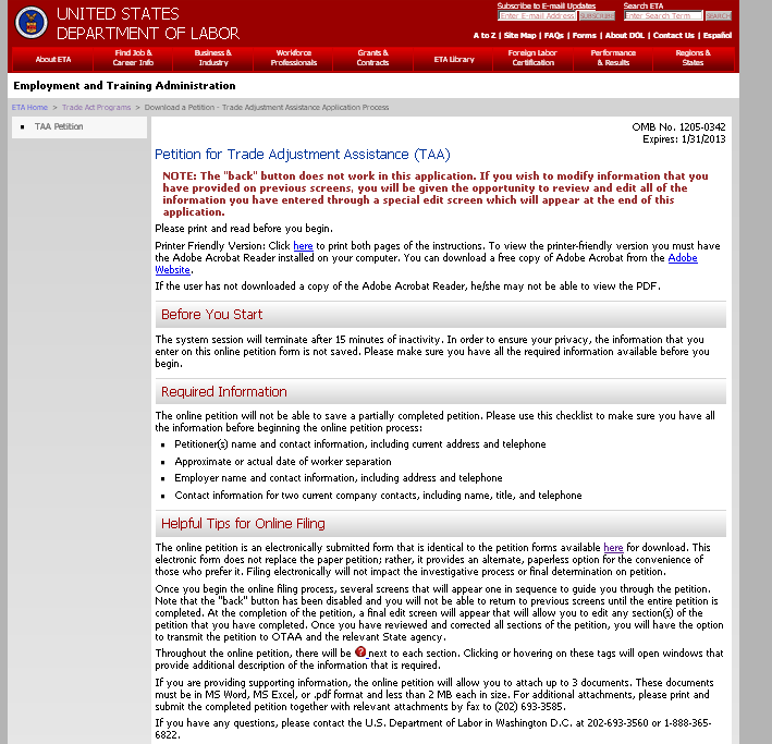 Petitioners may receive assistance in preparing the petition at their local American Job Center, by contacting the U.S. Department of Labor in Washington, D.C. at 202-693-3560 (Main Number), or by contacting their State Dislocated Worker Unit or State Workforce Agency through the telephone numbers or internet addresses provided above (29 CFR Part 90.11).