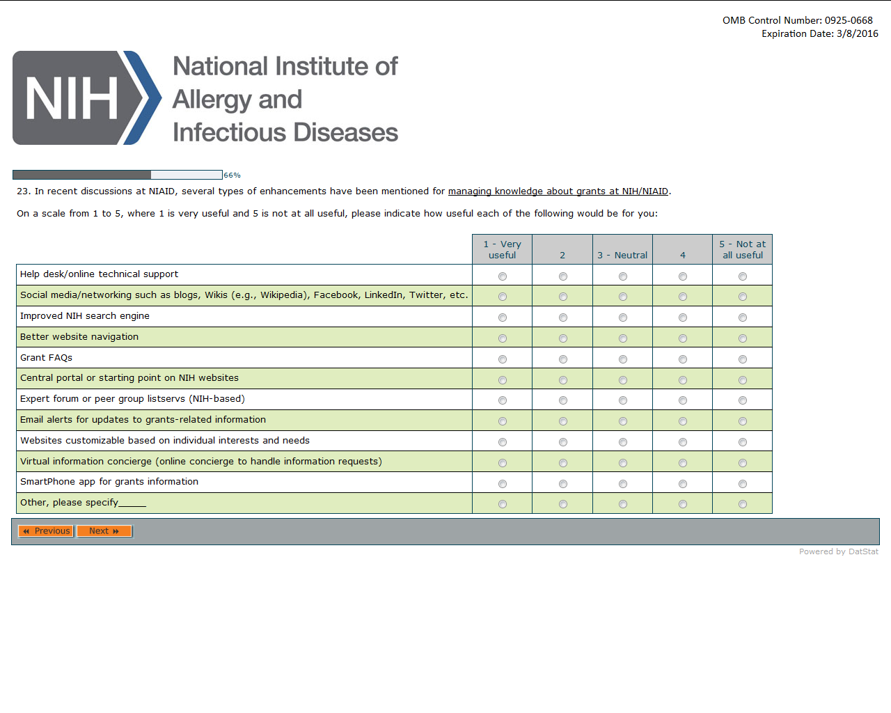 Online customer satisfaction survey for collecting feedback on NIH/NIAID grants-related knowledge management needs and resources