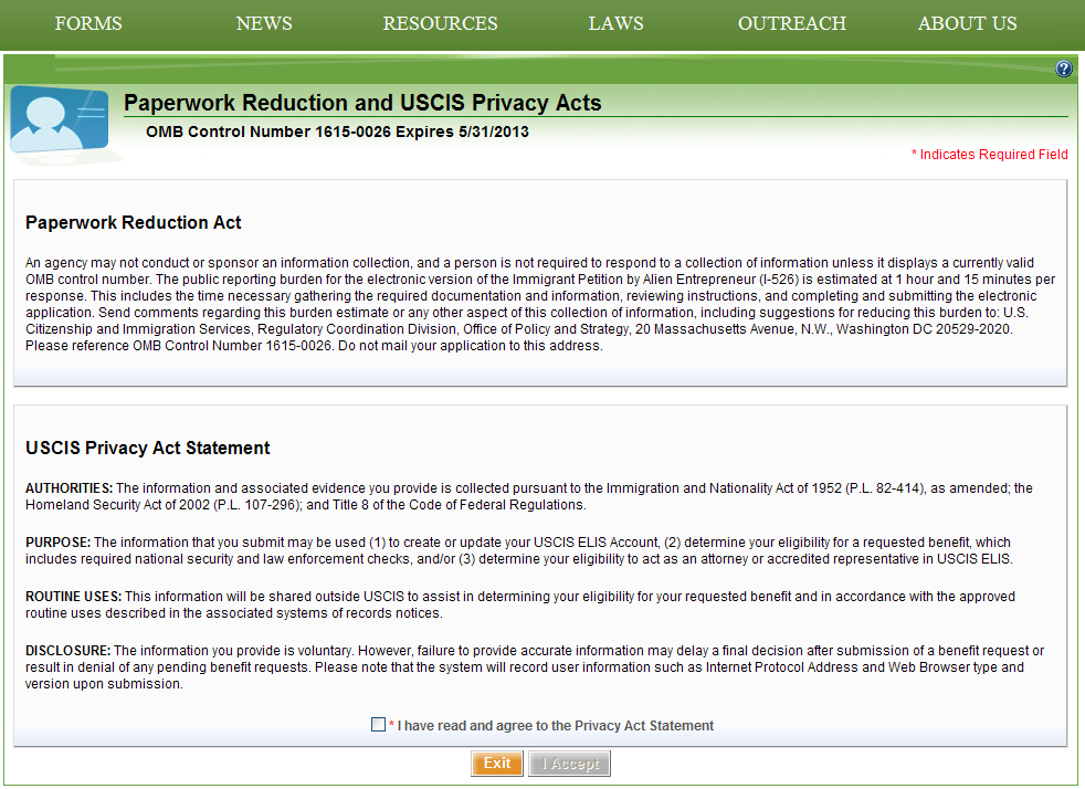 2b. **New Screen** Paperwork Reduction & Privacy Act Statements (after select checkbox)