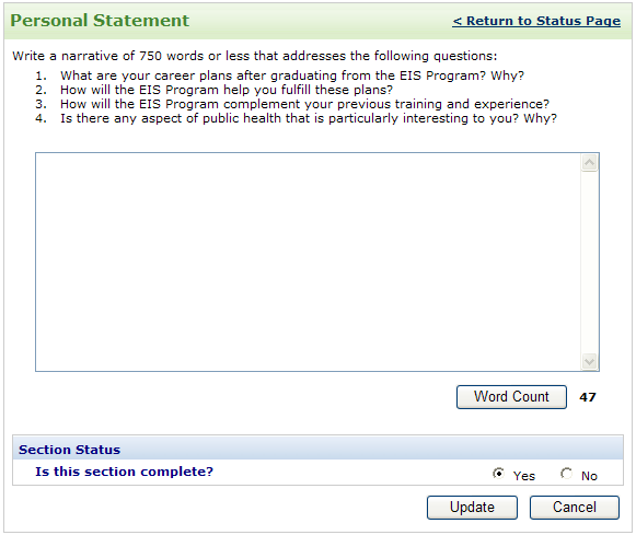 The Fellowship Management System (FMS) online application system is a streamlined application for the Centers for Disease Control and Prevention (CDC) fellowships where the applicants can submit their information online as well as track the various statuses of the application (i.e., all materials received, whether they are invited for interview). FMS is a robust flexible framework and has been successfully tailored for the various CDC fellowships including EIS.