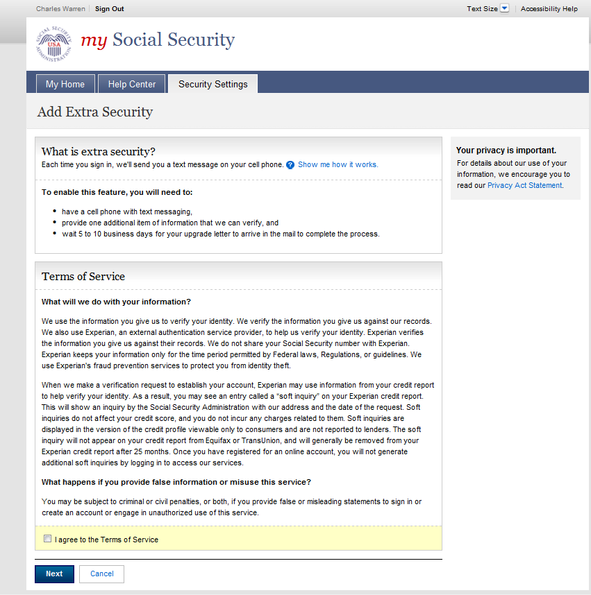 I assume responsibility for the disclosure of my personal information if the computer or other device that I am using to access the MySocialSecurity application does not adequately safeguard my information. I also understand that Social Security is not responsible for the disclosure of my information due to my negligence or for the wrongful acts of others.