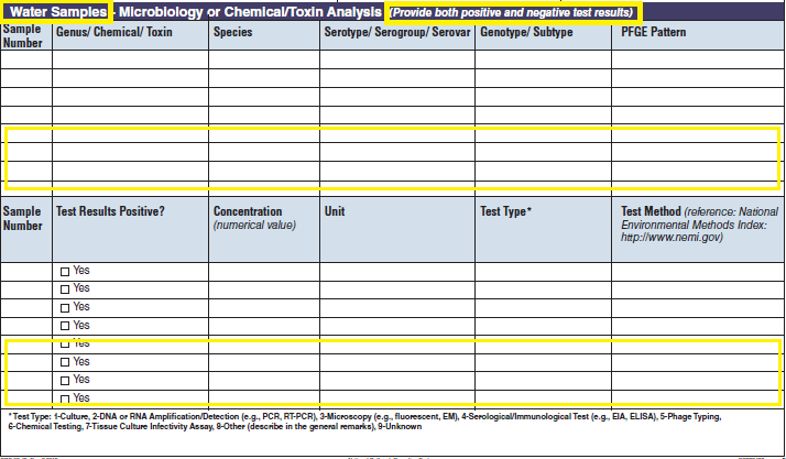 • All checkboxes and text for modes of transmission besides ’Water’ have been greyed out because this information is collected through a different reporting form (the CDC 52.13 form).