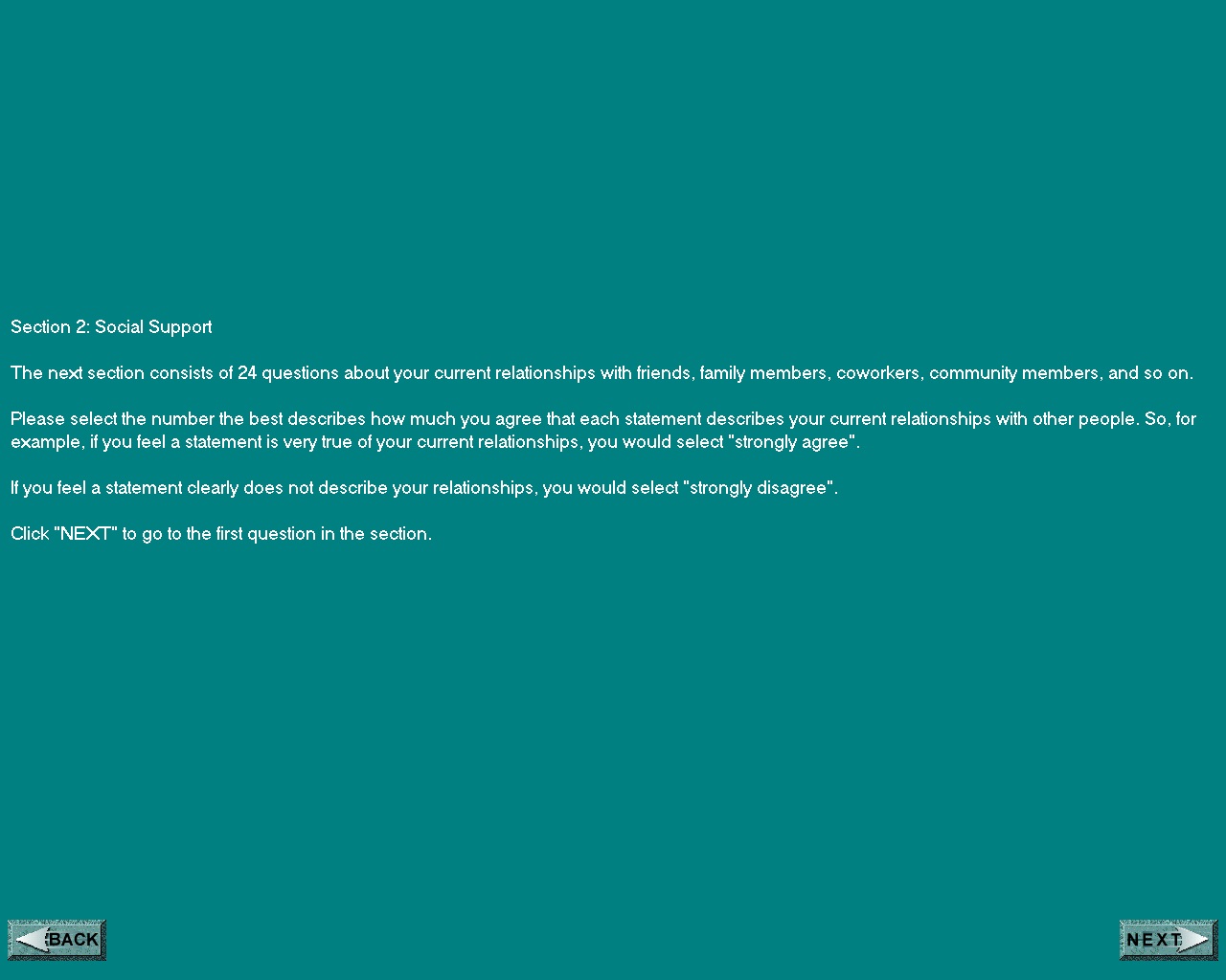 Designed to examine how respondent’s social relationships provide social support. Includes six constructs: (a) Attachment, (b) Social Integration, (c) Reassurance of Worth, (d) Reliable Alliance, (e) Guidance, and (f) Opportunity for Nurturance.