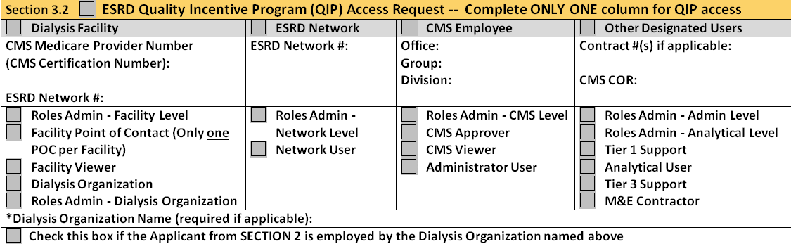 Added Section 3.2 ESRD Quality Incentive Program (QIP) Access Request. Added Organization Types. Added ESRD QIP user roles. |