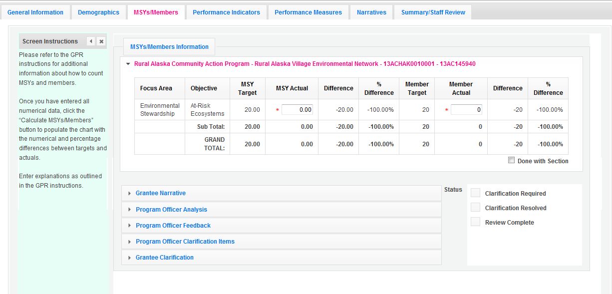 For each tab where data is entered, the CNCS Program Officer reviews data and determines whether clarification is necessary. If no clarification is required, the Program Officer closes out the GPR. If clarification is required, the Program Officer checks the “Clarification Required” box on each tab that requires clarification and returns the GPR for rework.