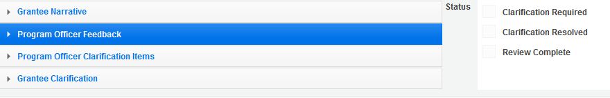 Grantee Clarification Items – Grantees use this text field to enter their responses to the clarification items that appear in the Program Officer Clarification Items field.