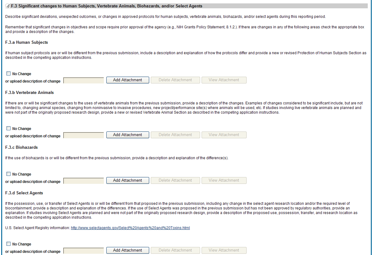 F.3 Significant changes to Human Subjects, Vertebrate Animals, Biohazards, and/or Select Agents