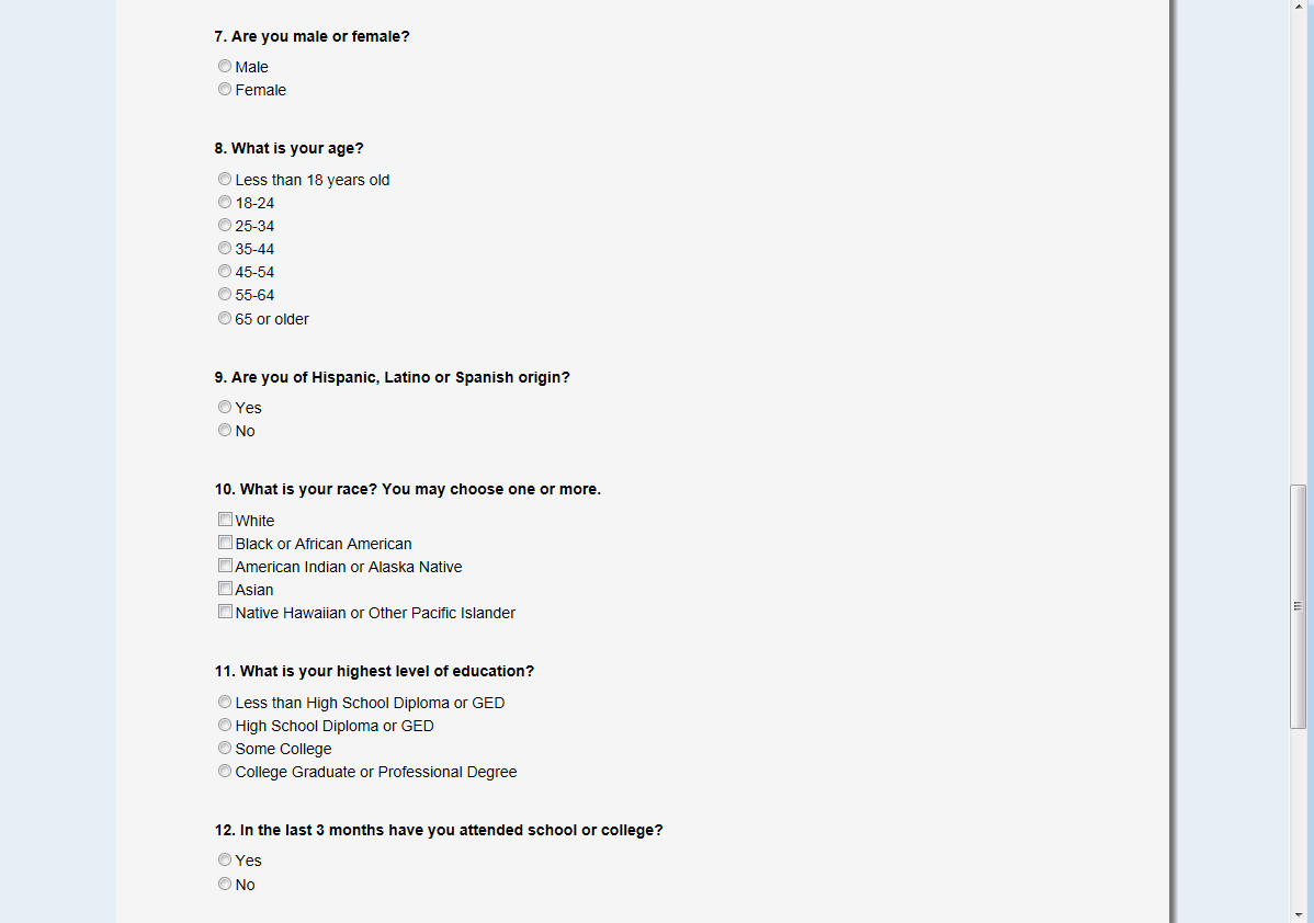This survey will need to be mobile optimized following the guidelines used in the 2015 Census Test and the 2015 National Content Test. Many of the screens have been used in prior small-scale research projects with only minor changes to the questions or numbering. |