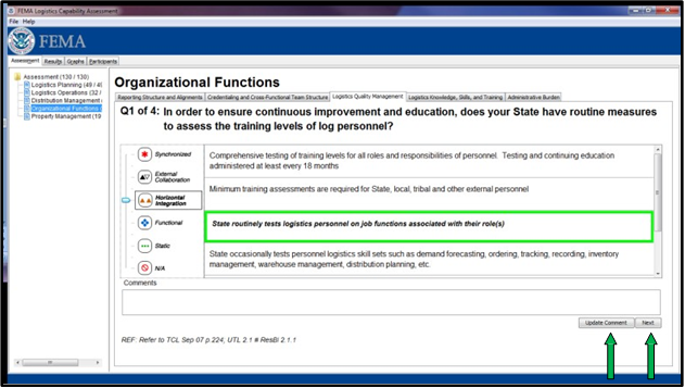 Using a standardized approach and validated measurement criteria, LCAT objectively evaluates jurisdictional capability to perform basic logistics response and recovery functions and targets specific areas that need improvement. These capability levels should not be equated to a 1-5 scoring system, and the top-most level is not always the best fit for every state. There is a ―Not Applicable‖ option for all questions, so states should not feel compelled to find ways to make capability levels applicable. If the question is not indicative of a capability appropriate for the state, ―Not Applicable‖ could be the most appropriate response. |