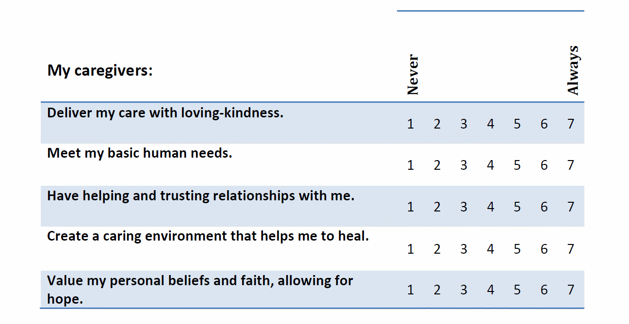 DIRECTIONS: When answering the questions, please consider the overall consistency of human-to-human CARE you have received during this hospital stay. Please circle the number for the one best answer.