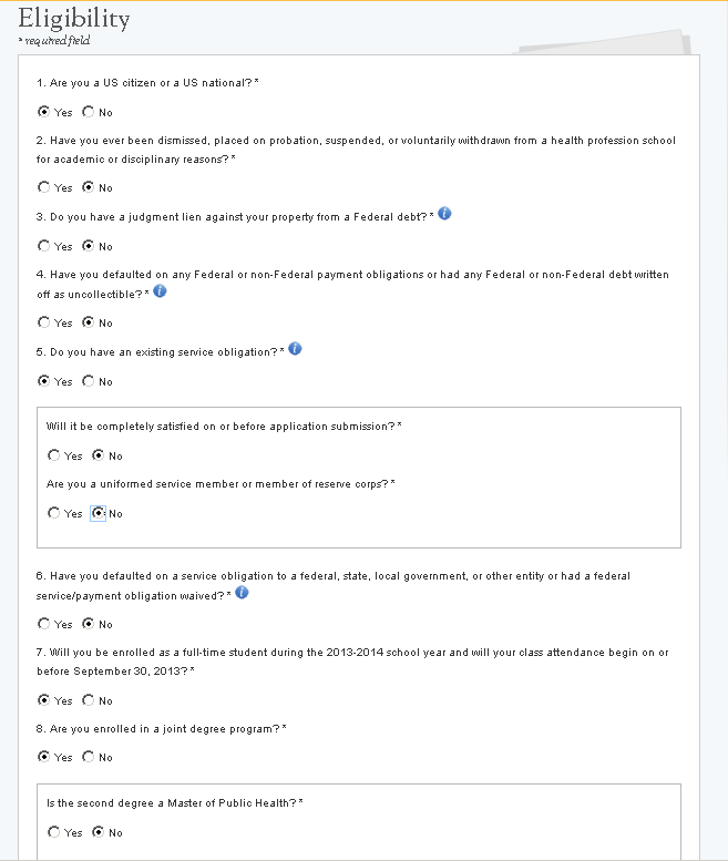 The Eligibility page is used to ensure the applicant meets the qualification requirements to apply for an NHSC SP application. If the applicant is deemed eligible, he/she will be able to continue with the application. If an individual does not pass the initial screening portion of the online application, he/she will not be able to continue with the application.