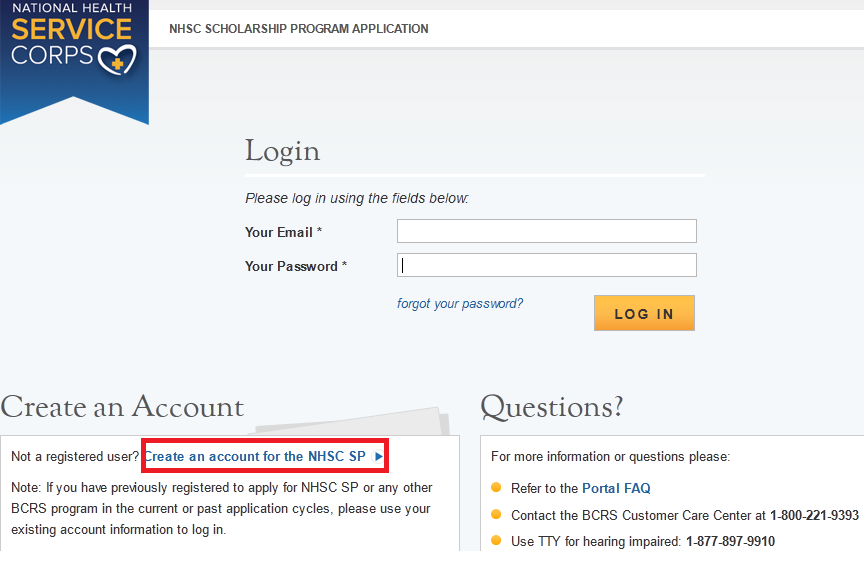 The BCRS Portal allows applicants to navigate to the NHSC SP application. Note: Applicant will skip this page if he/she links directly from the HRSA website.