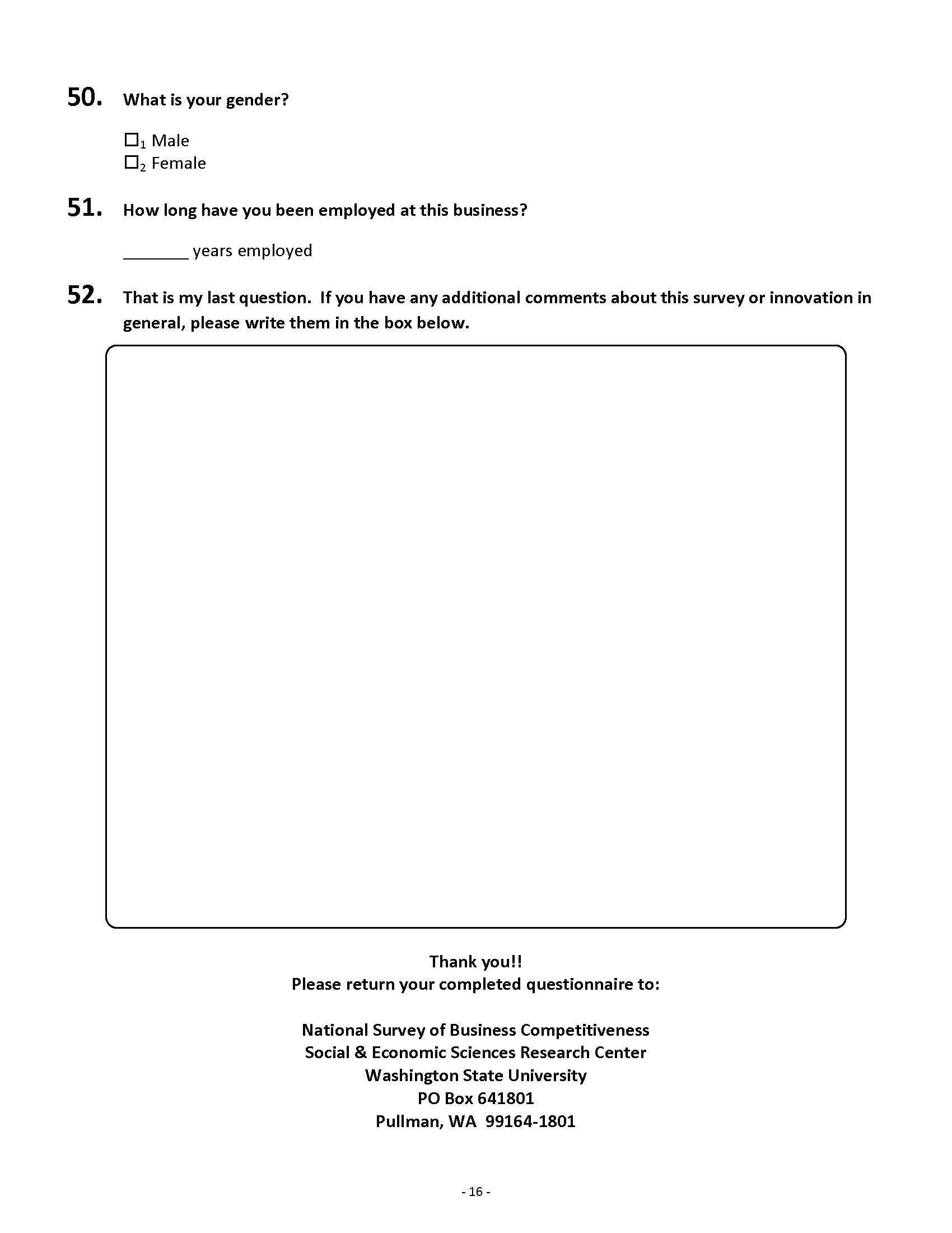 The Social and Economic Sciences Research Center (SESRC) is conducting the survey for ERS and plans to have an in-depth interview with a small number of local businesses first to identify any problems or issues in questions, wordings or format visual design.